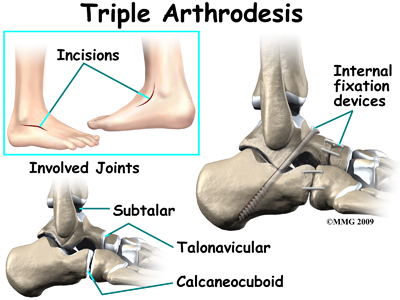 The most common surgical procedures used with this condition include arthrodesis (fusion), osteotomy (cutting out a wedge-shaped piece of bone), and lateral column lengthening. Lateral column lengthening involves the use of a bone graft at the calcaneocuboid joint, which helps restore the medial longitudinal arch (arch along the inside of the foot).