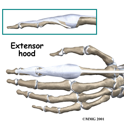 The tendons that allow each finger joint to straighten are called the extensor tendons. The extensor tendons of the fingers begin as muscles that arise from the backside of the forearm bones. These muscles travel towards the hand, where they eventually connect to the extensor tendons before crossing over the back of the wrist joint. As they travel into the fingers, the extensor tendons become the . The extensor hood flattens out to cover the top of the finger and sends out branches on each side that connect to the bones in the middle and end of the finger.