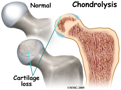 There are two complications of SCFE that may occur immediately after the condition develops. The first complication is , a condition where the articular cartilage of the hip joint is destroyed. Articular cartilage is the smooth material that covers the joint surface. It is unclear why this condition develops. It may occur if the SCFE has been treated with or without surgery. This condition results in narrowing of the joint space and a painful, stiff hip.